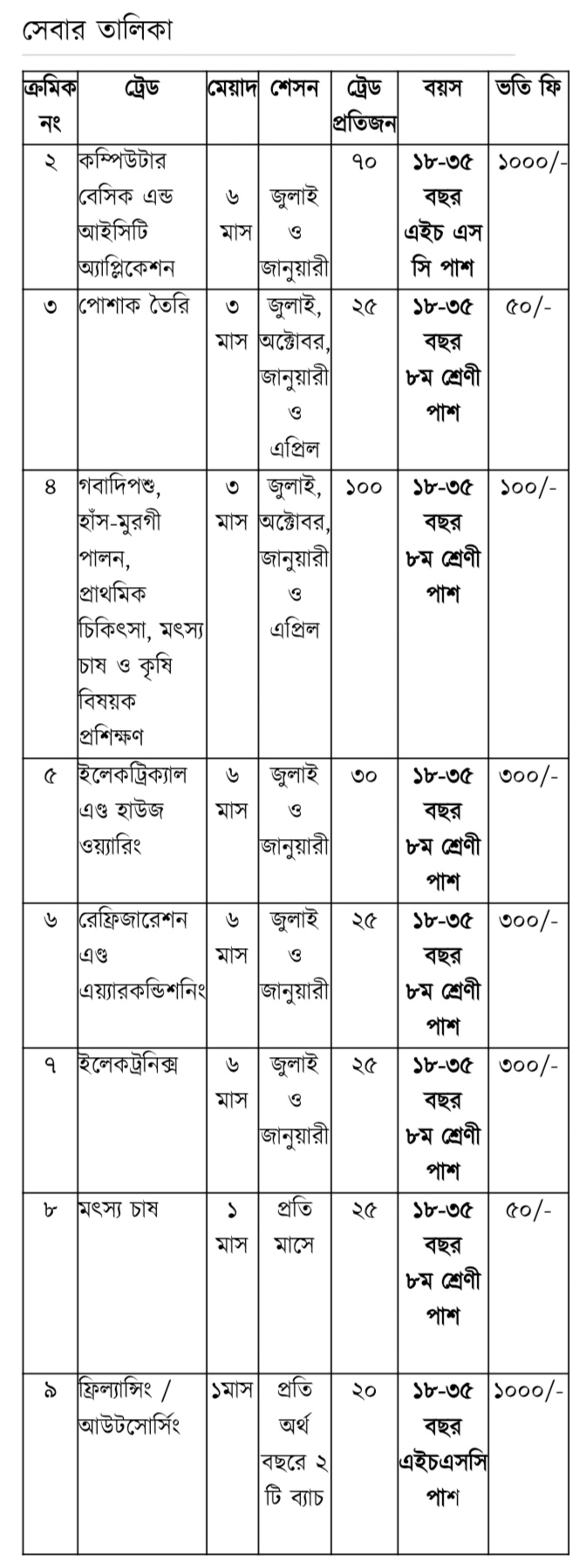 যুব উন্নয়ন অধিদপ্তর, নীলফামারী জেলা কার্যালয় কর্তৃক নিম্ন লিখিত ট্রেডে প্রশিক্ষণ সংক্রান্ত সেবা প্রদান করা হয়